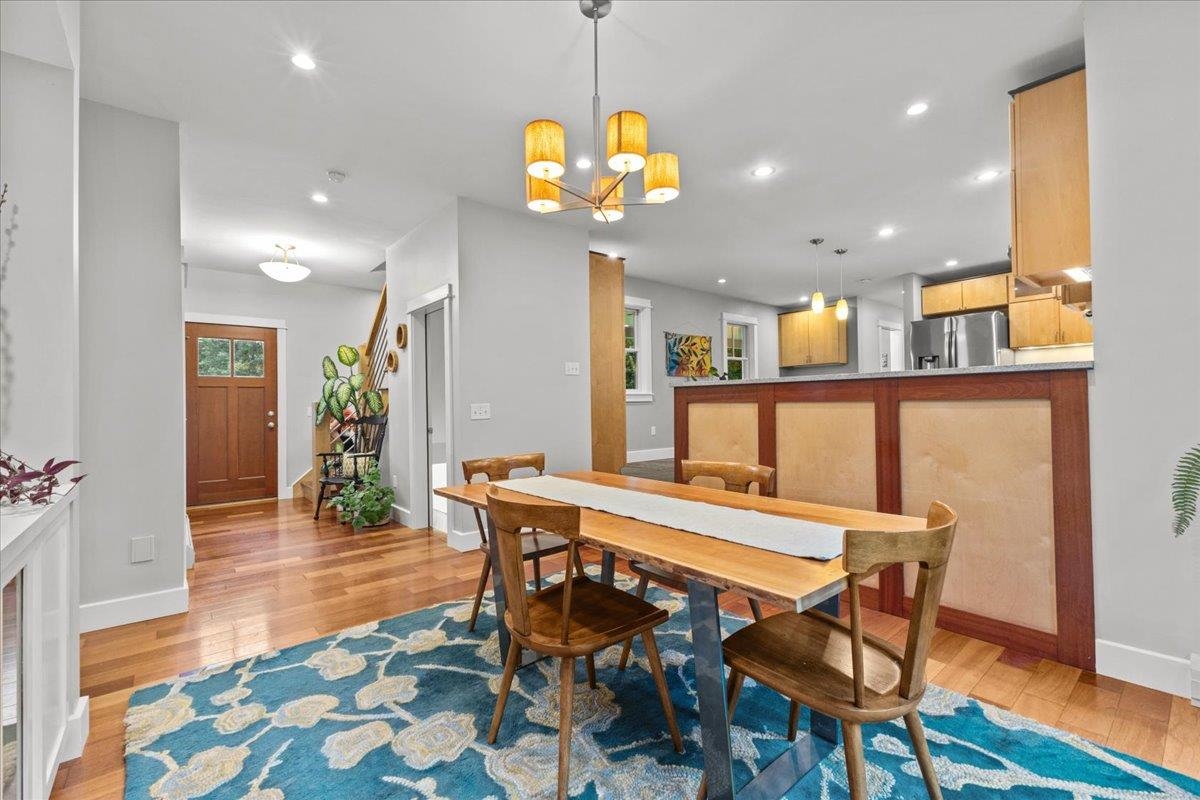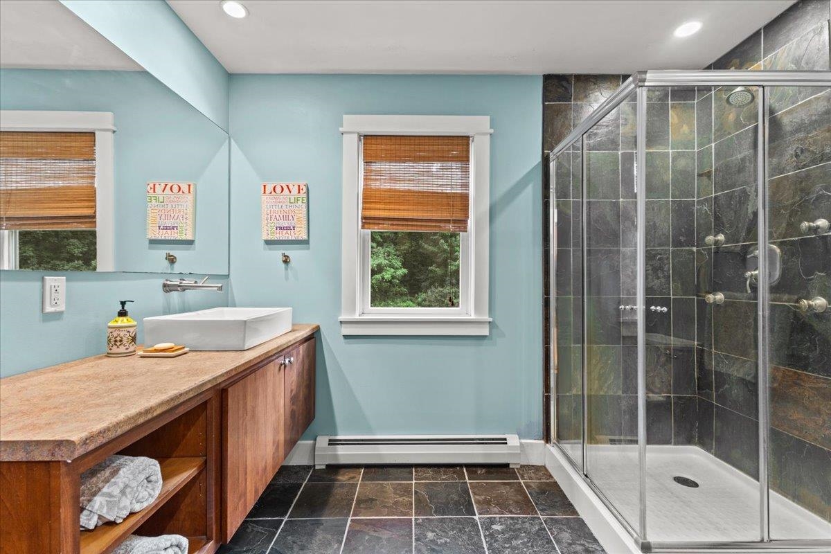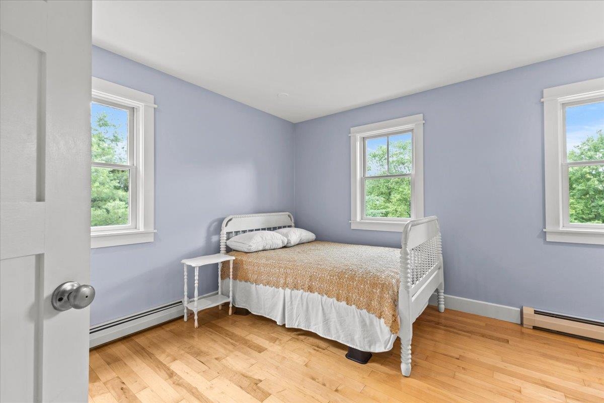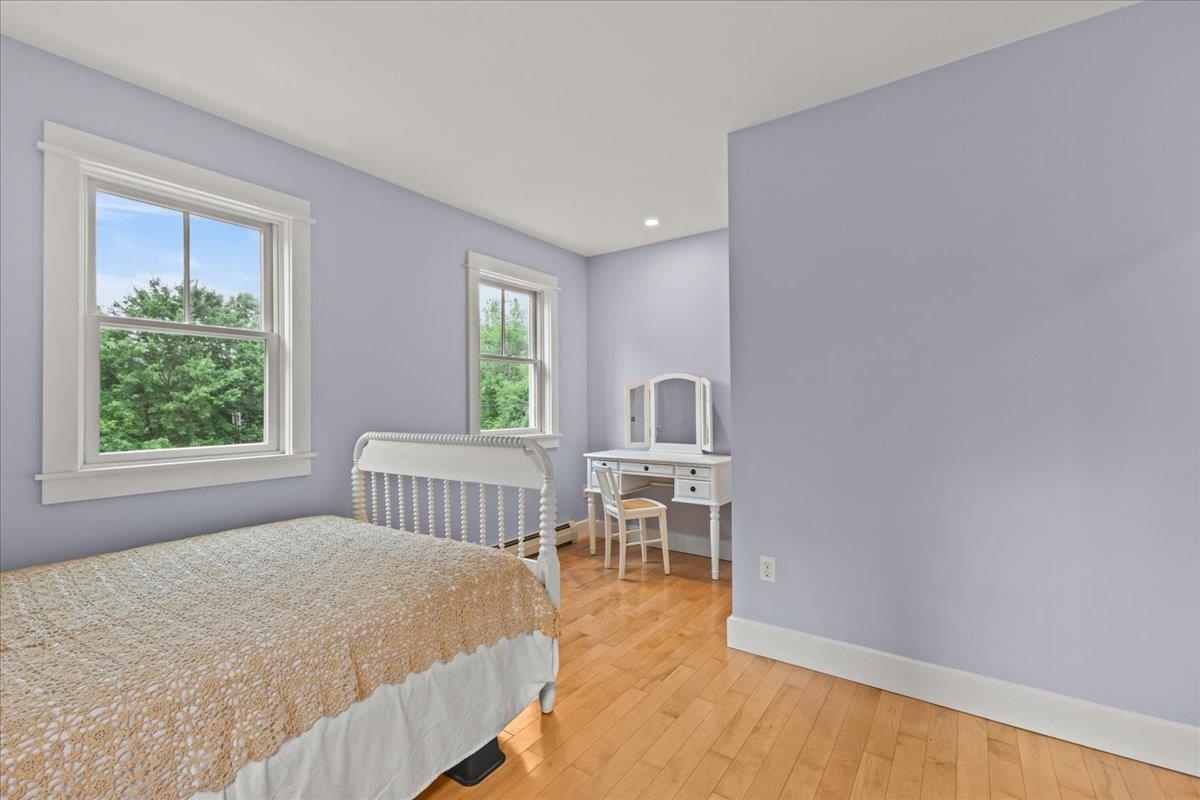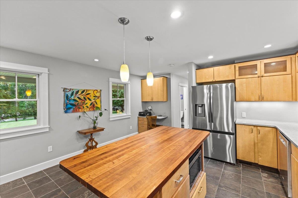 Welcome to this beautifully maintained 4-bedroom, 2.5-bathroom home, situated on 1.44 private, wooded acres. Offering a perfect blend of suburban convenience and rural charm, this home combines the classic farmhouse style with all of the modern amenities making it the ideal retreat for families or those seeking a peaceful, yet accessible, Vermont lifestyle. Step inside to find a warm and inviting interior. As you enter you are greeted by a mudroom and half bath with beautiful slate flooring. Next you find the open-concept kitchen featuring butcher block island, granite countertops, custom cabinets, stainless steel appliances and radiant heat. Step down to the dining area with built-ins which opens to the large living room with cozy wood stove and adjacent den. All three rooms feature gorgeous Brazilian cherry hardwood floors and the space has great natural light making perfect for entertaining or just hanging out. Upstairs, the primary suite includes a walk-in closet and en-suite bath with a tiled shower. It also has direct access to the bonus room above the garage making it a great remote work option. Three additional bedrooms provide ample space for family or guests. There is a full bath with double vanity & laundry on the second floor as well. The home's oversized barn style garage provides plenty of storage. The home's wrap around porch overlooks the phenomenal yard featuring beautiful mature landscaping. And to top it off, it is a short walk to historic Jericho Center! |
