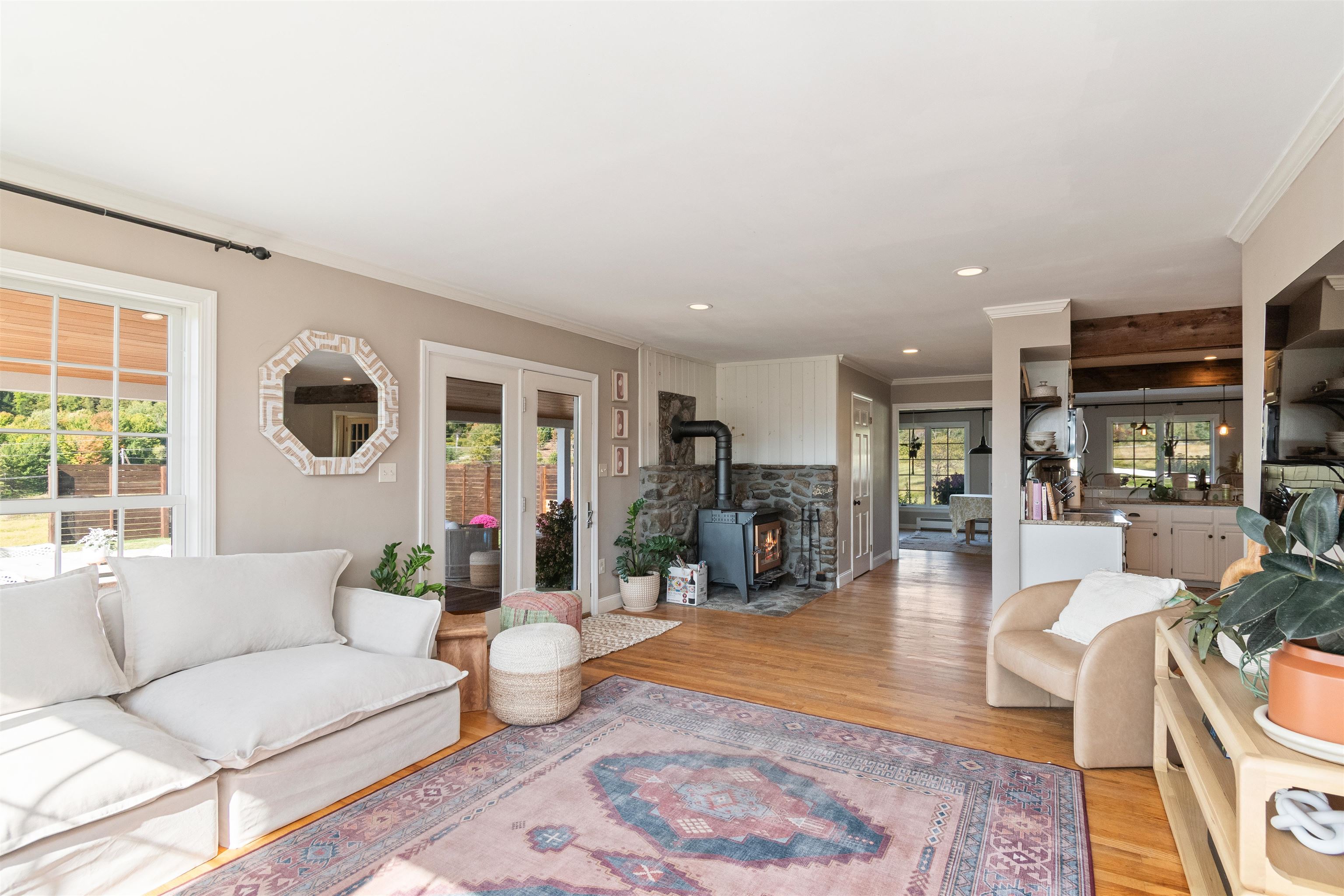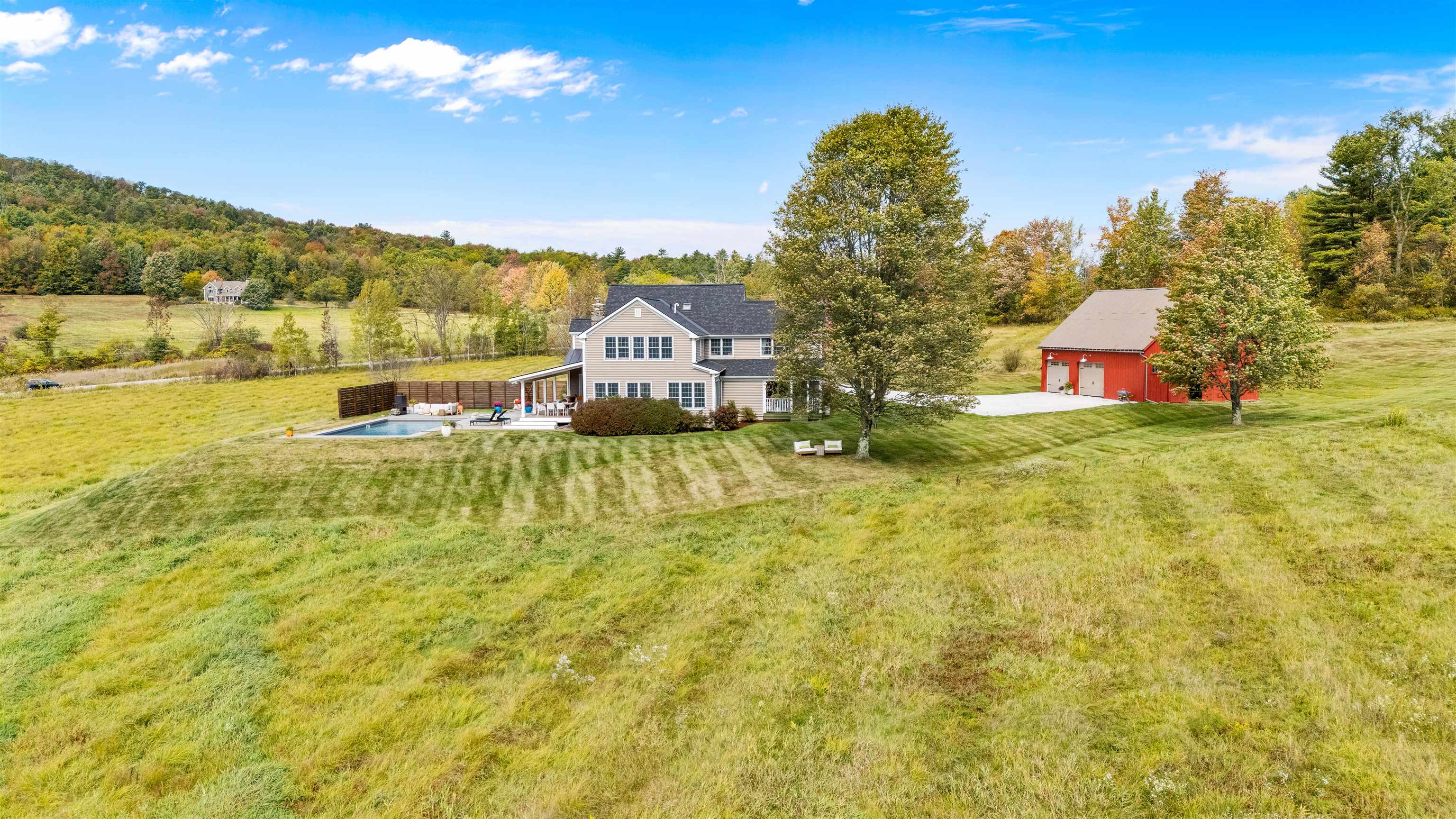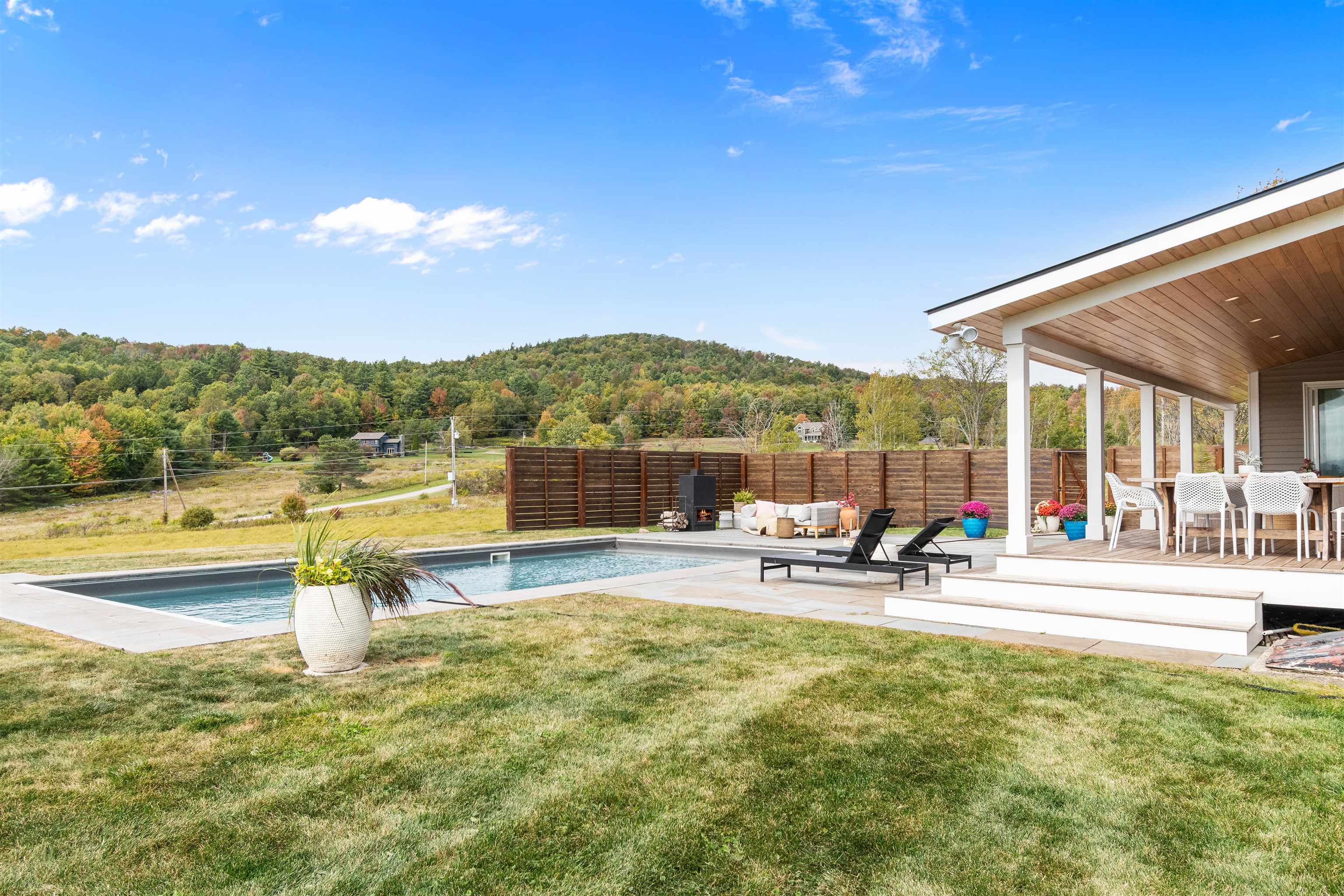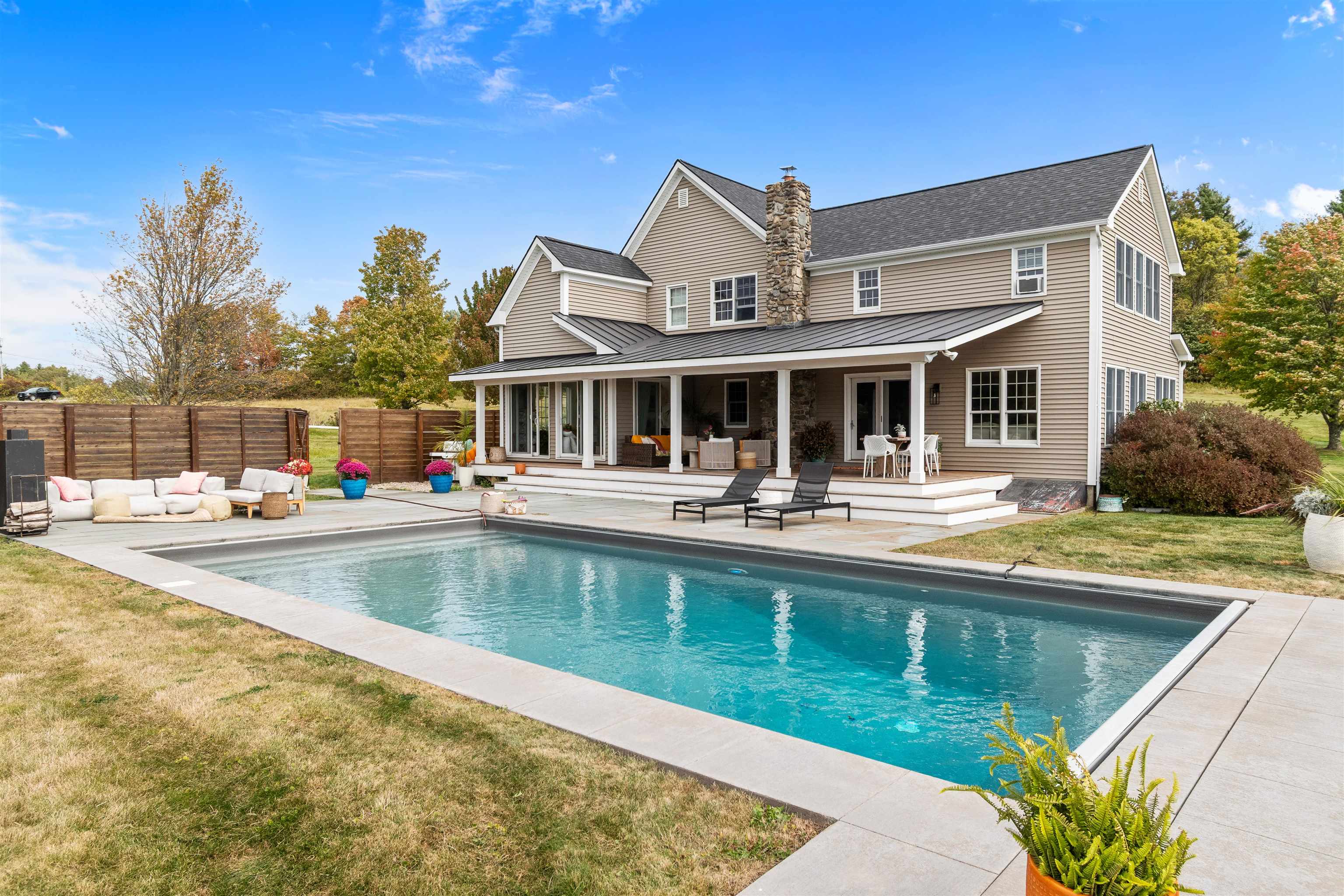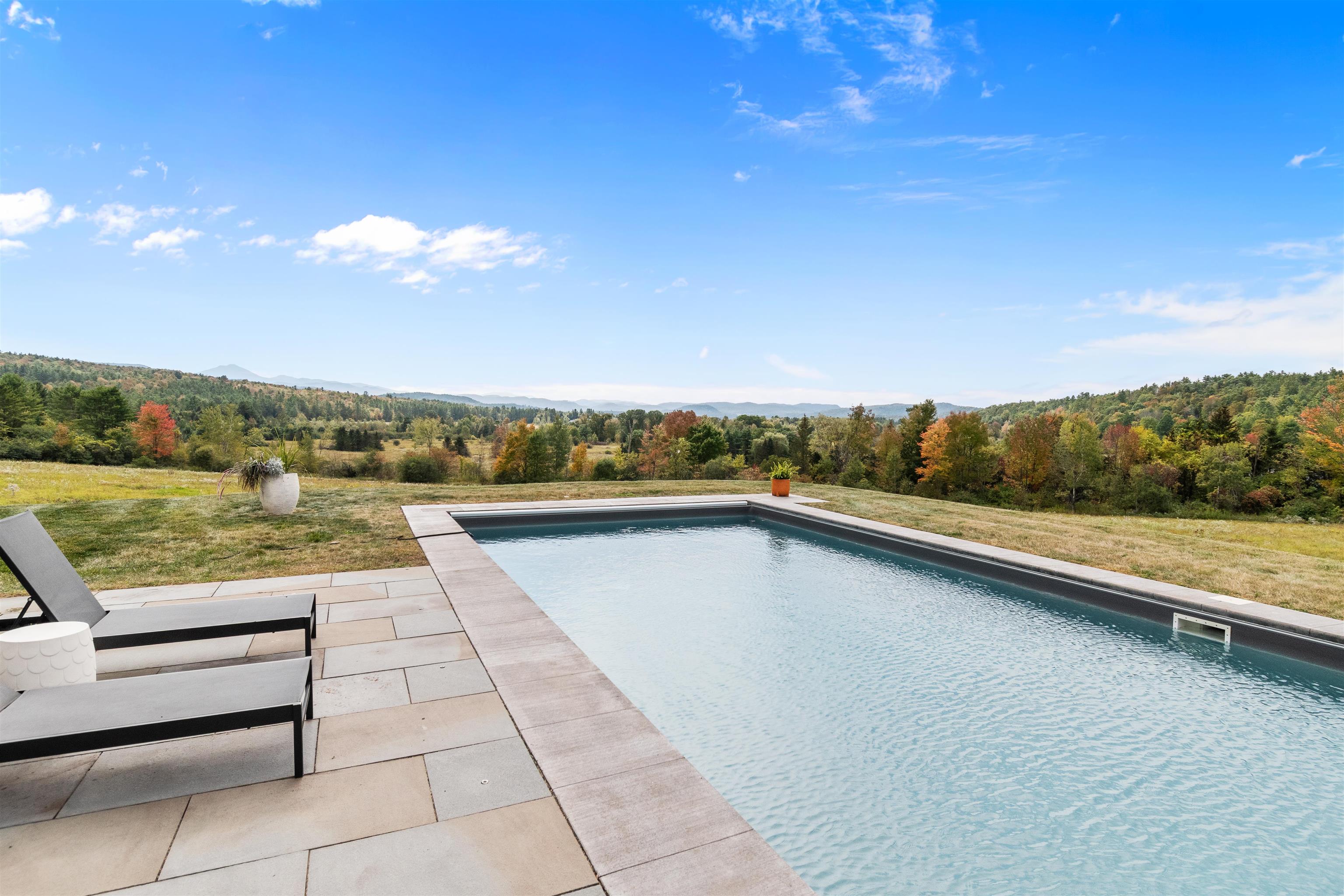 This stylish farmhouse is perfectly situated on 13 acres to take advantage of stunning panoramic Green Mountain views with a classic red barn and a resort-like outdoor space. The spacious, open concept interior features hardwood flooring throughout, exposed beam accents, and windows all around to offer views from every room. At the heart of the home, the kitchen makes entertaining a breeze with a walnut island, breakfast bar, granite counters, and stainless appliances. Unwind in the living room while the fire crackles in stone fireplace or find comfort in the warmth of the wood stove with stone surround in the family room. The primary suite is a true retreat with a cozy sitting room with built-ins, a sliding barn door to the private bath with separate vanities and a glass walk-in shower, custom closet system, and sweeping mountain views. The finished lower level extends your living space with a rec room with built-ins and small wet bar. The property delivers exceptional outdoor living with the mountains as the backdrop. A covered teak deck provides room for a relaxing seating area as well as outdoor dining. Step down to a blue stone patio that surrounds the tranquil inground pool, with space for lounge chairs, your barbecue, and a seating area around the outdoor fireplace. All of the peace and beauty of country living balanced with convenient access to I-89, just 8 miles to Williston shops and restaurants, and 17 miles to downtown Burlington. |