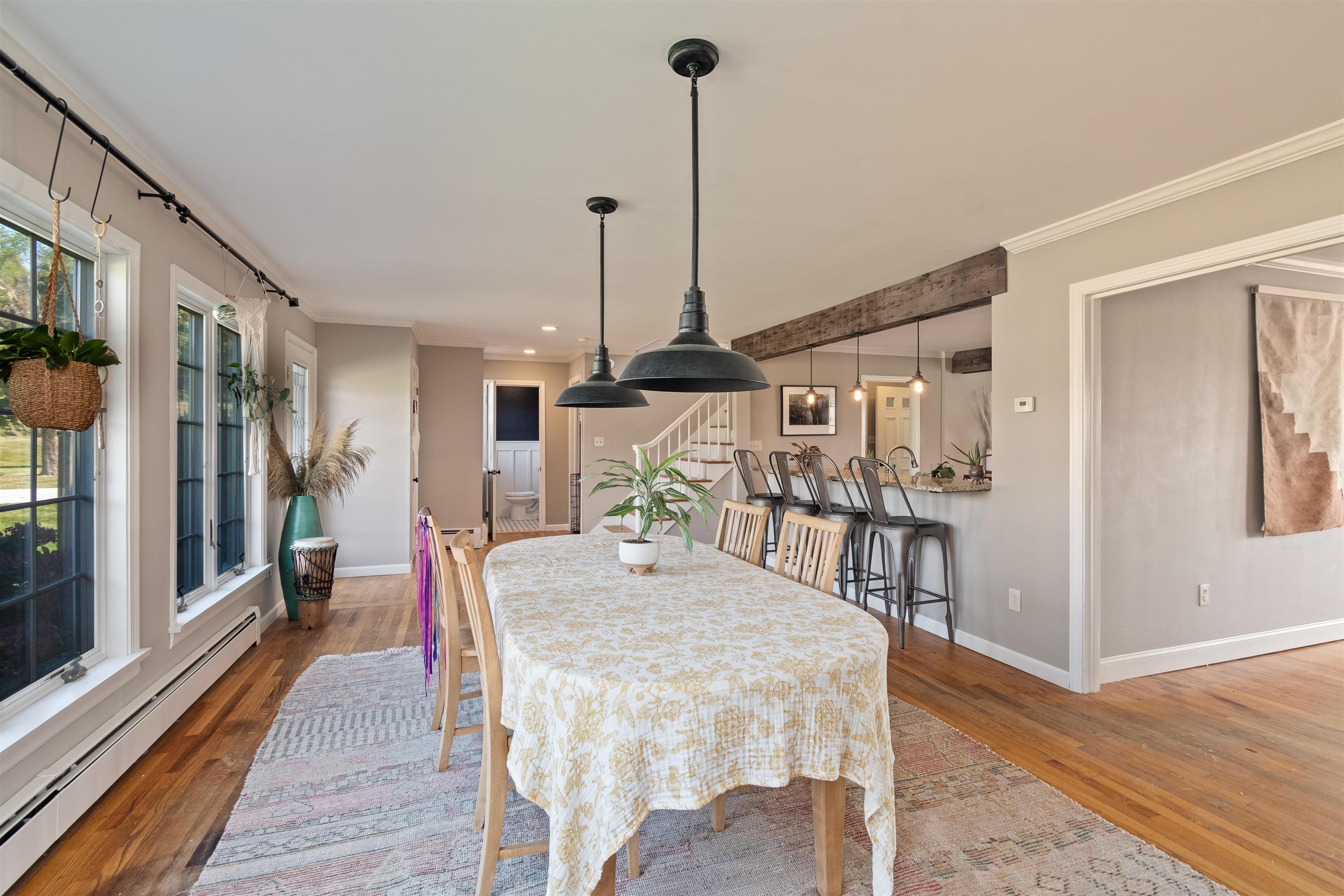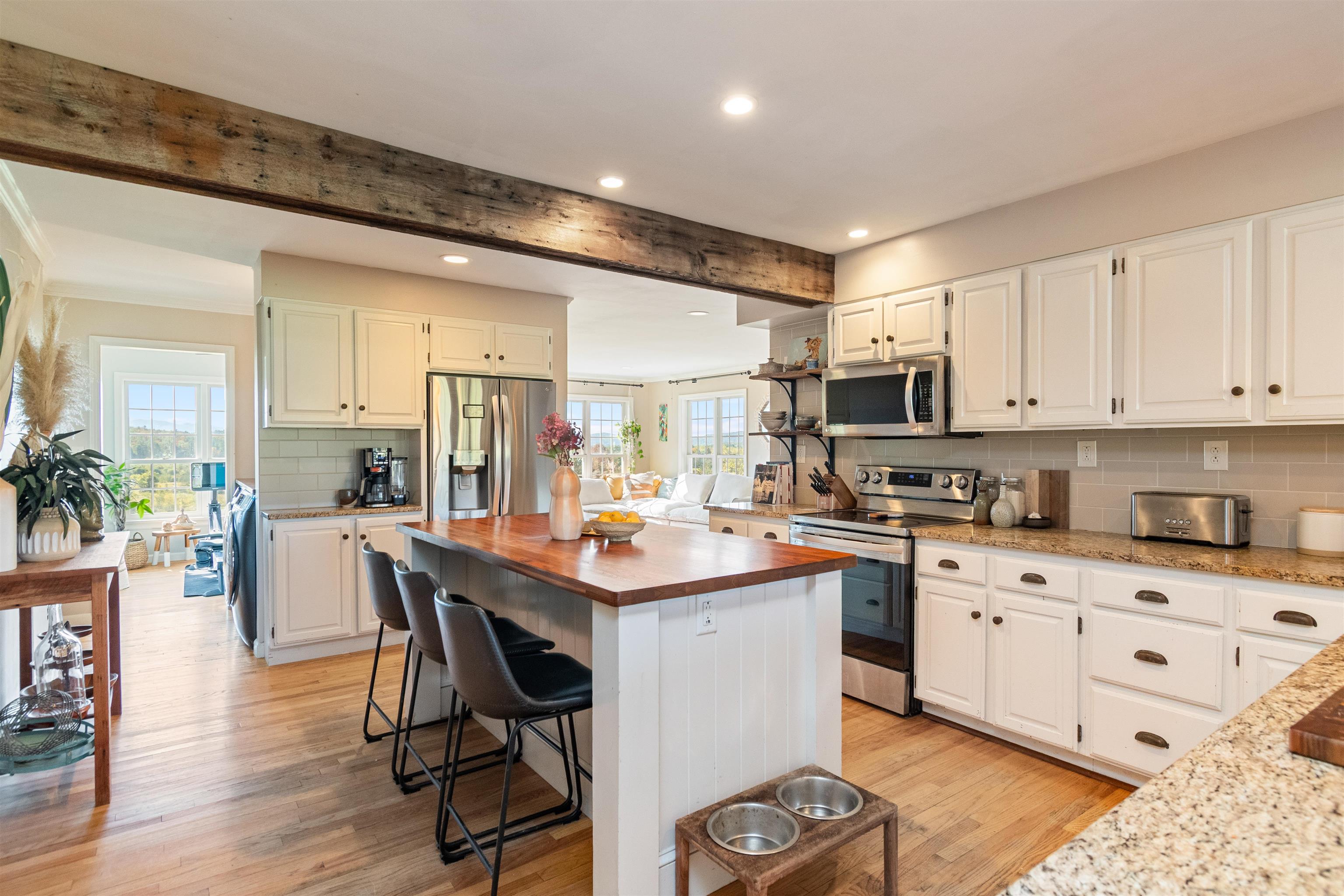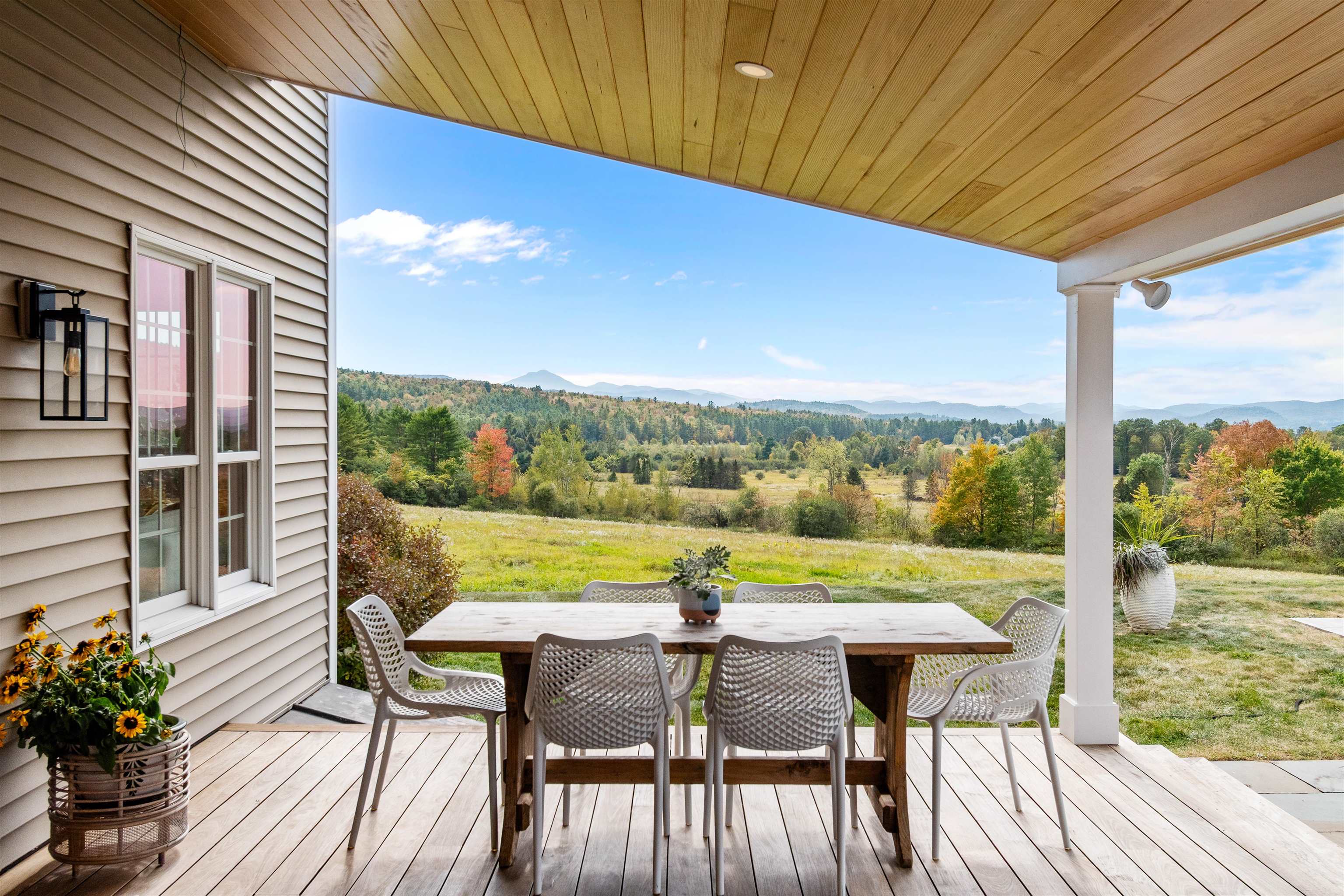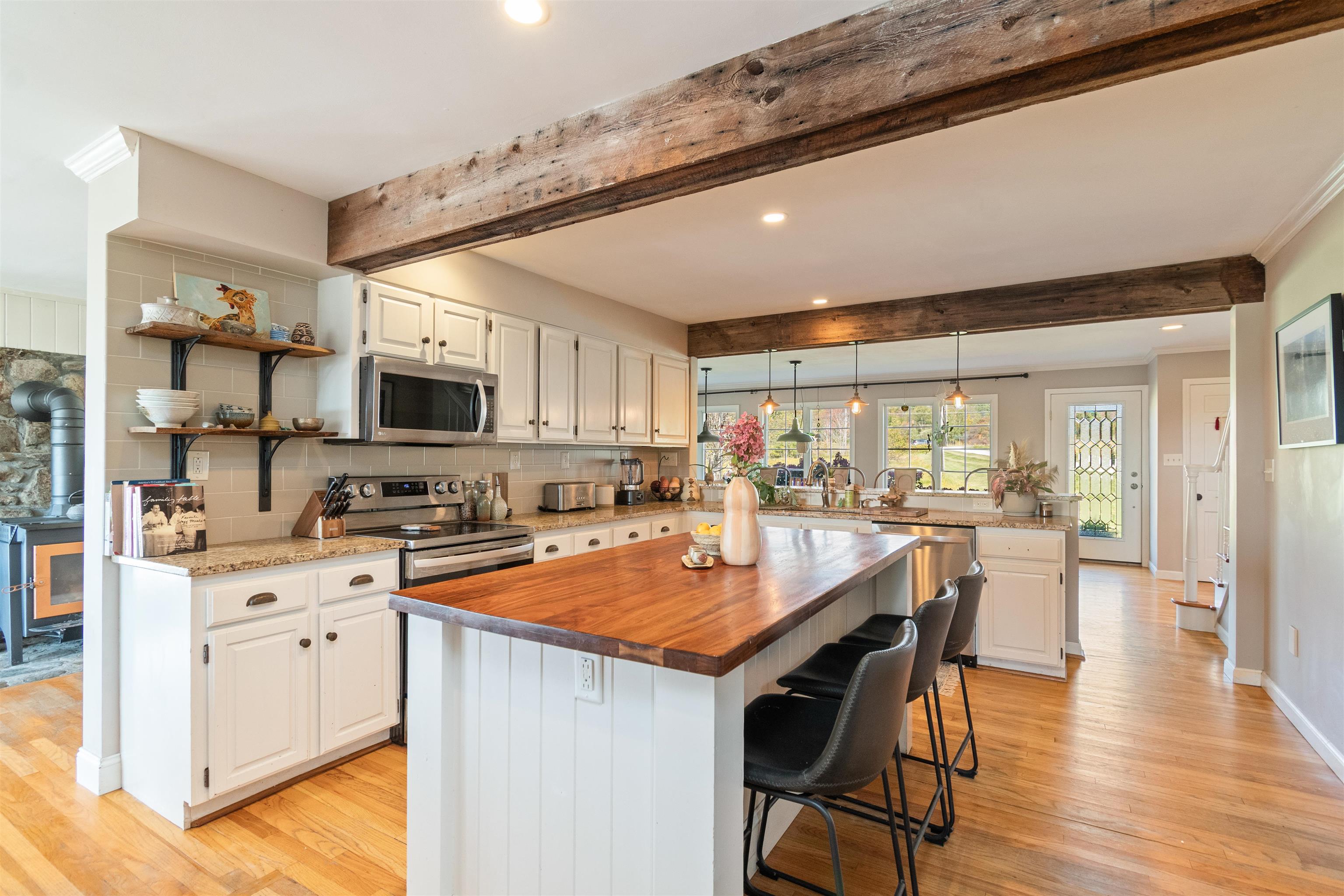 This stylish farmhouse is perfectly situated on 13 acres to take advantage of stunning panoramic Green Mountain views with a classic red barn and a resort-like outdoor space. The spacious, open concept interior features hardwood flooring throughout, exposed beam accents, and windows all around to offer views from every room. At the heart of the home, the kitchen makes entertaining a breeze with a walnut island, breakfast bar, granite counters, and stainless appliances. Unwind in the living room while the fire crackles in stone fireplace or find comfort in the warmth of the wood stove with stone surround in the family room. The primary suite is a true retreat with a cozy sitting room with built-ins, a sliding barn door to the private bath with separate vanities and a glass walk-in shower, custom closet system, and sweeping mountain views. The finished lower level extends your living space with a rec room with built-ins and small wet bar. The property delivers exceptional outdoor living with the mountains as the backdrop. A covered teak deck provides room for a relaxing seating area as well as outdoor dining. Step down to a blue stone patio that surrounds the tranquil inground pool, with space for lounge chairs, your barbecue, and a seating area around the outdoor fireplace. All of the peace and beauty of country living balanced with convenient access to I-89, just 8 miles to Williston shops and restaurants, and 17 miles to downtown Burlington. |