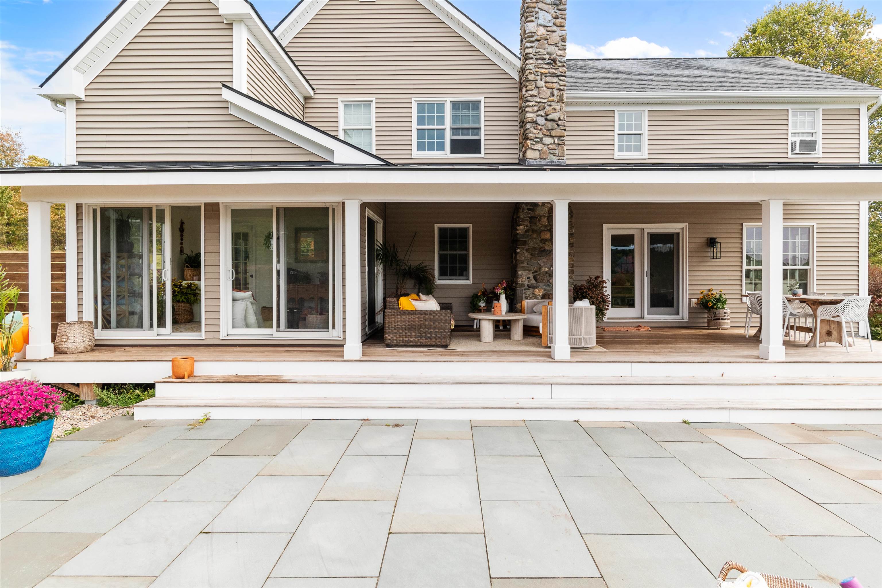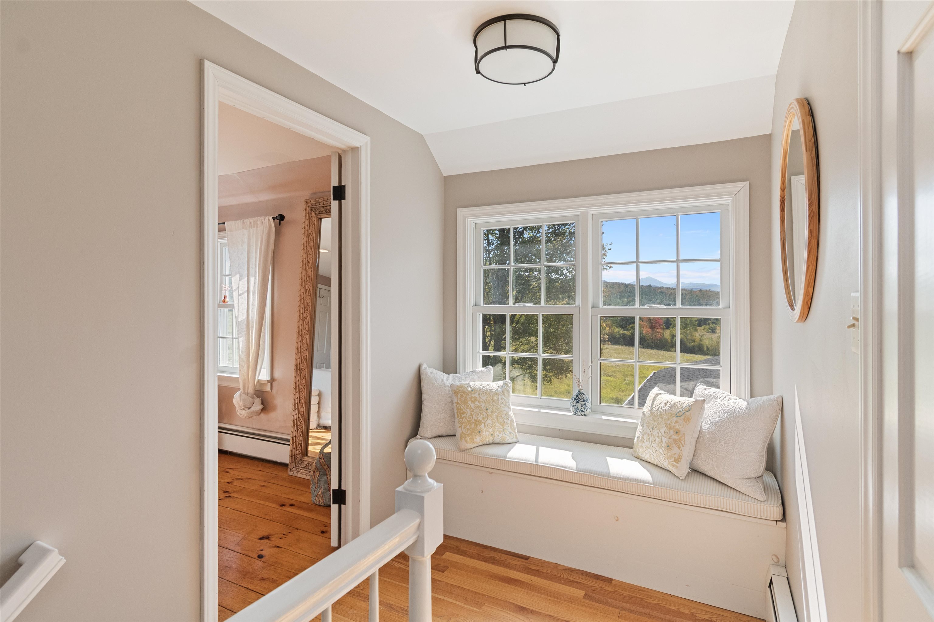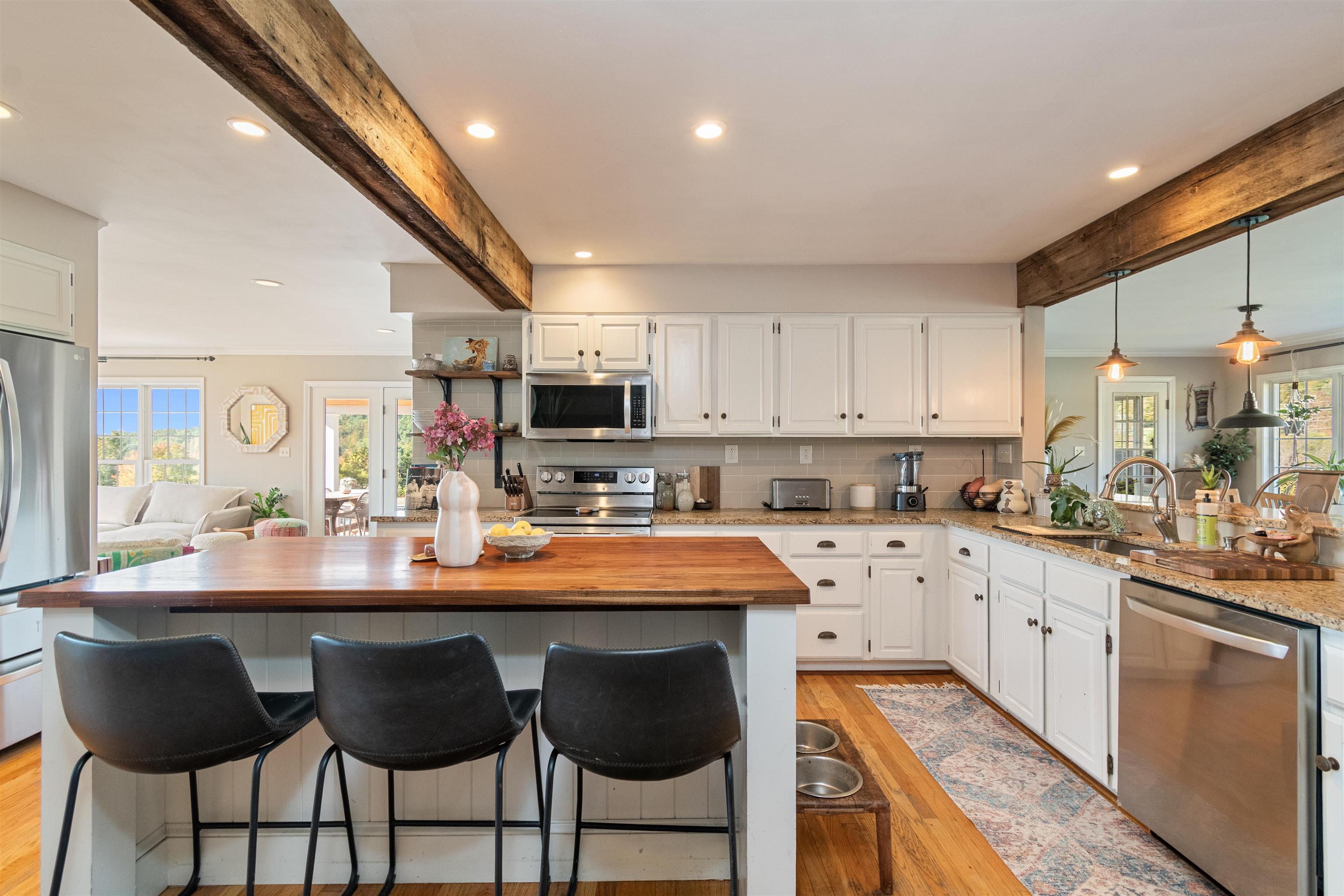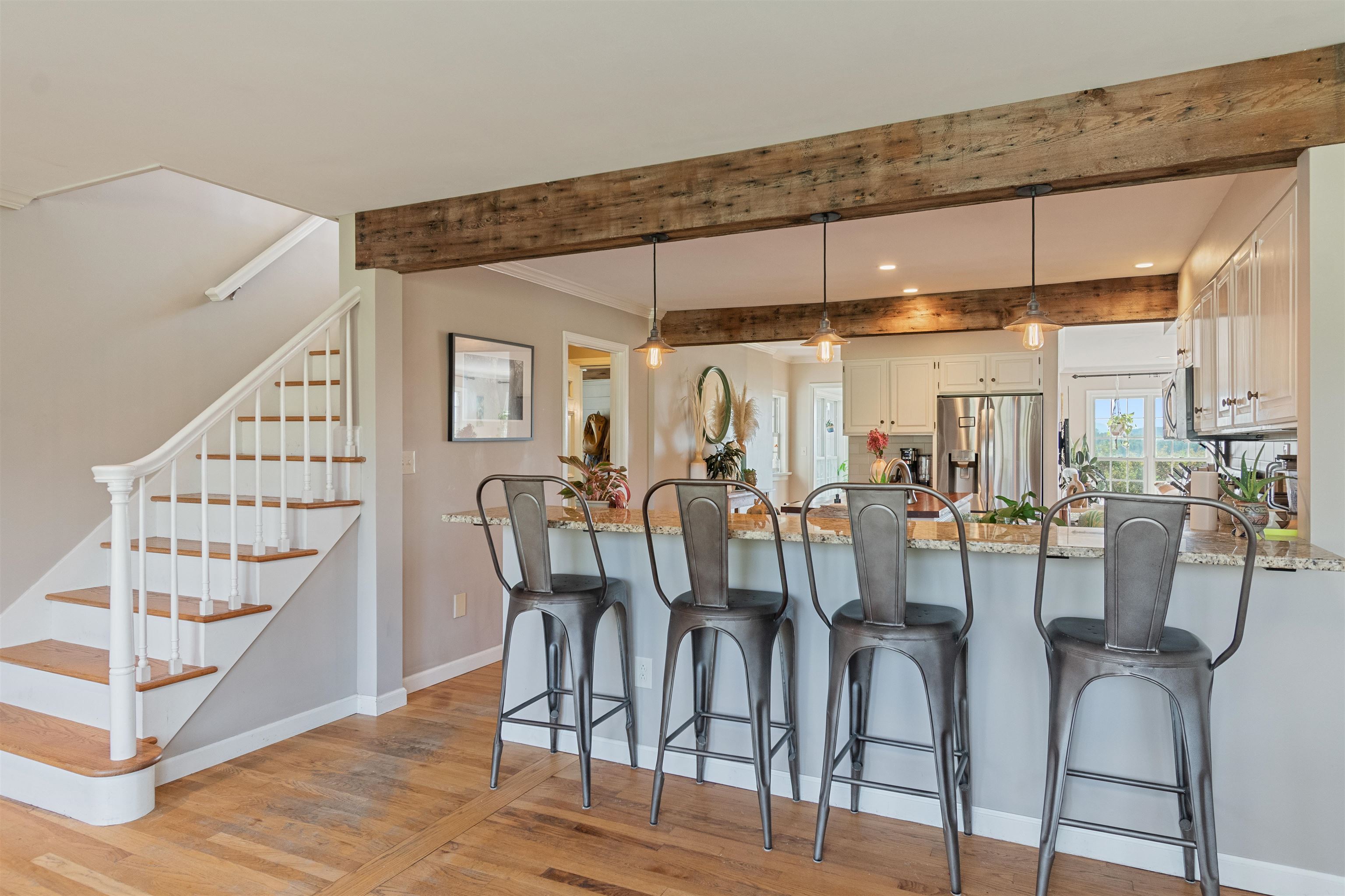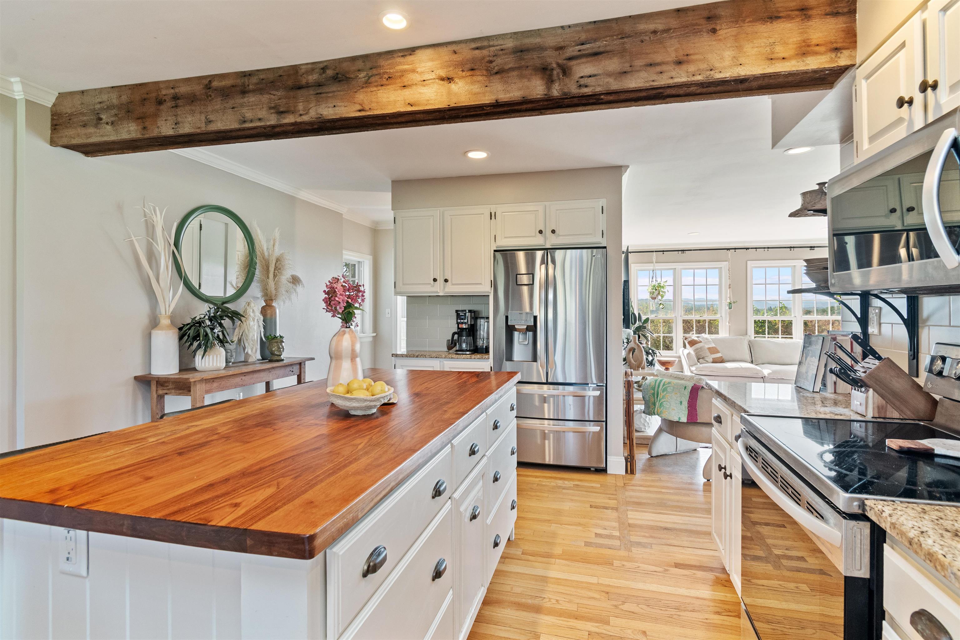 This stylish farmhouse is perfectly situated on 13 acres to take advantage of stunning panoramic Green Mountain views with a classic red barn and a resort-like outdoor space. The spacious, open concept interior features hardwood flooring throughout, exposed beam accents, and windows all around to offer views from every room. At the heart of the home, the kitchen makes entertaining a breeze with a walnut island, breakfast bar, granite counters, and stainless appliances. Unwind in the living room while the fire crackles in stone fireplace or find comfort in the warmth of the wood stove with stone surround in the family room. The primary suite is a true retreat with a cozy sitting room with built-ins, a sliding barn door to the private bath with separate vanities and a glass walk-in shower, custom closet system, and sweeping mountain views. The finished lower level extends your living space with a rec room with built-ins and small wet bar. The property delivers exceptional outdoor living with the mountains as the backdrop. A covered teak deck provides room for a relaxing seating area as well as outdoor dining. Step down to a blue stone patio that surrounds the tranquil inground pool, with space for lounge chairs, your barbecue, and a seating area around the outdoor fireplace. All of the peace and beauty of country living balanced with convenient access to I-89, just 8 miles to Williston shops and restaurants, and 17 miles to downtown Burlington. |