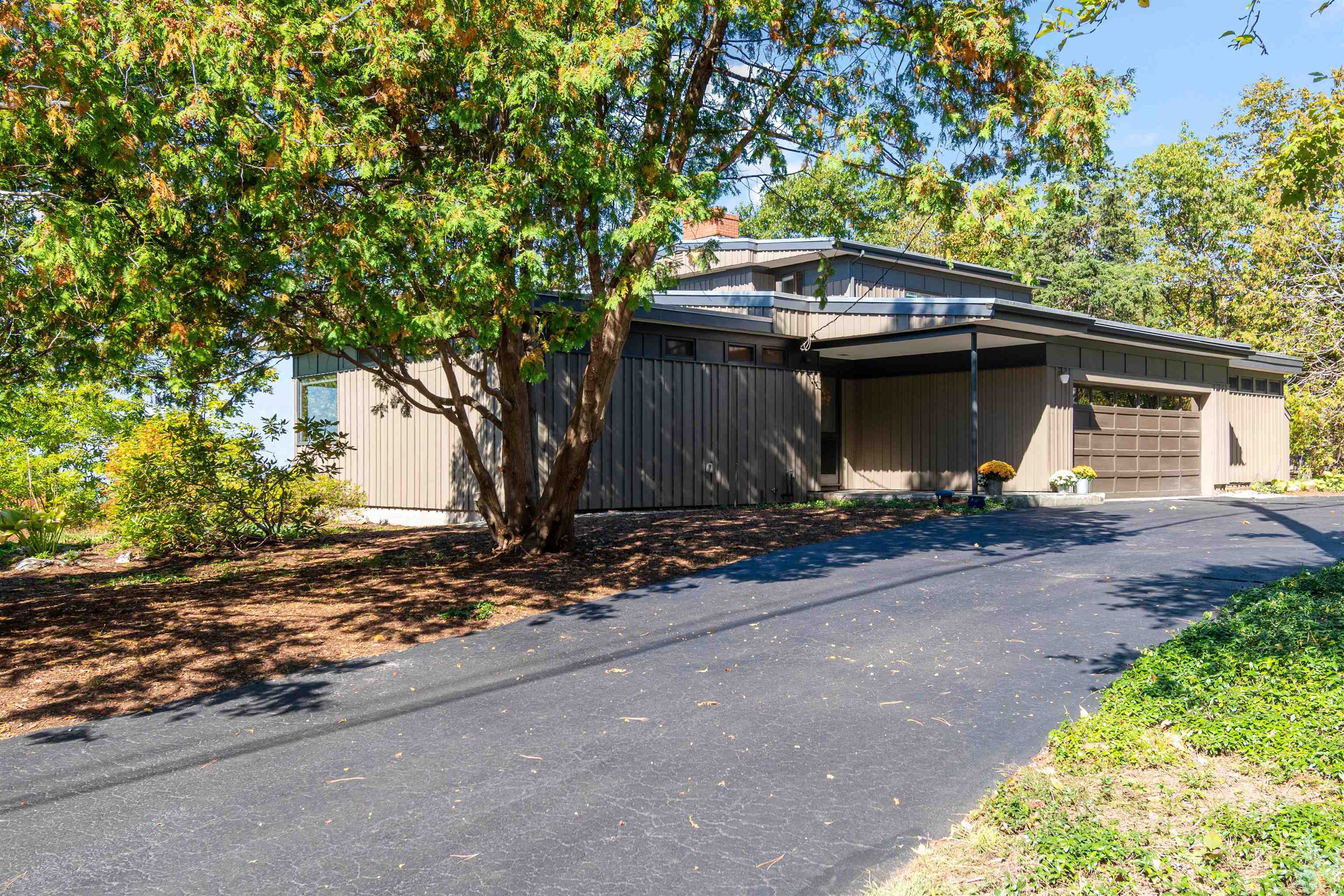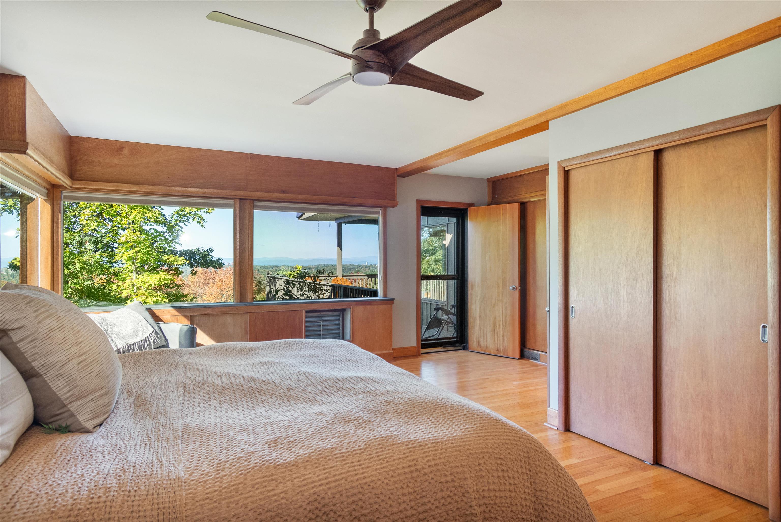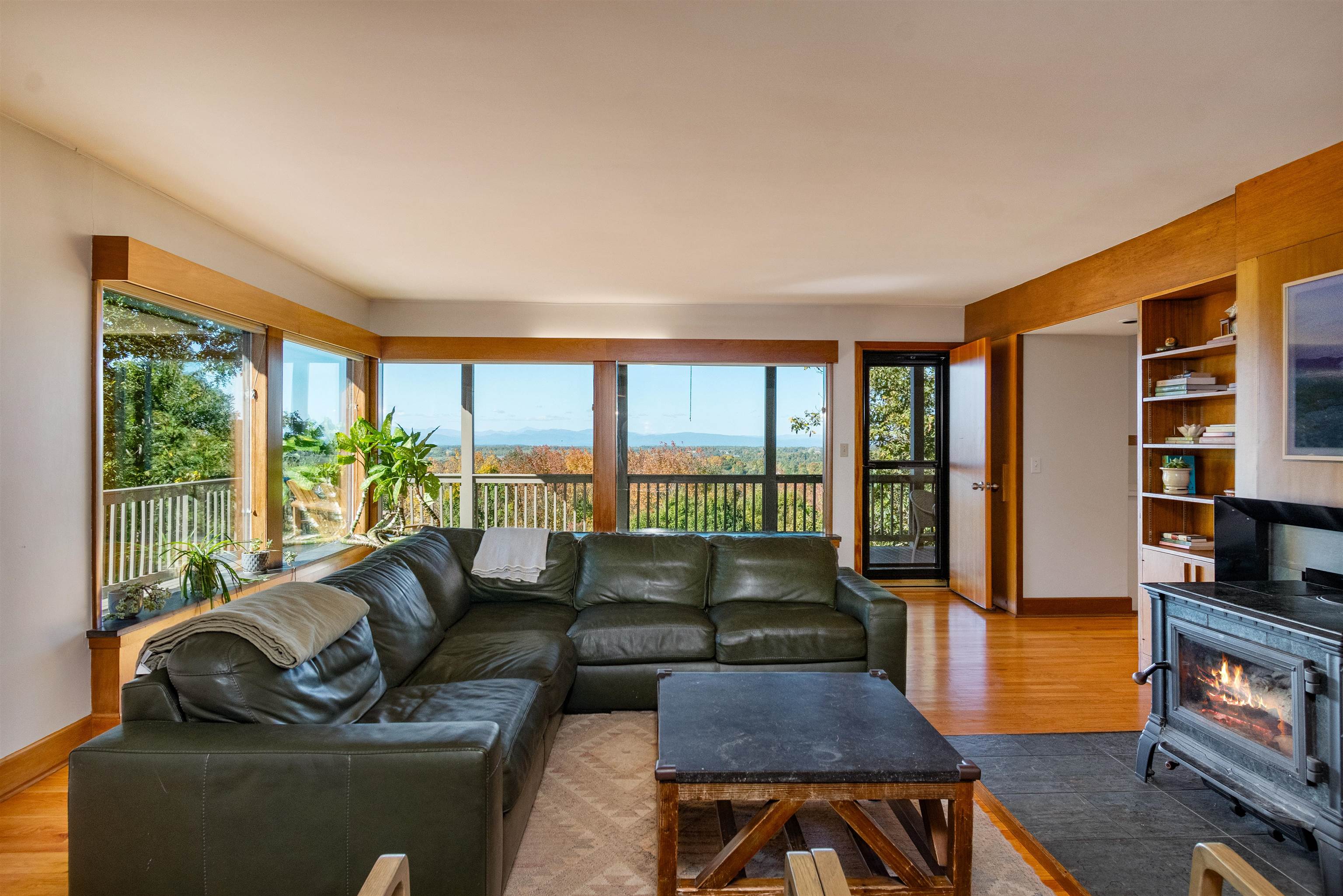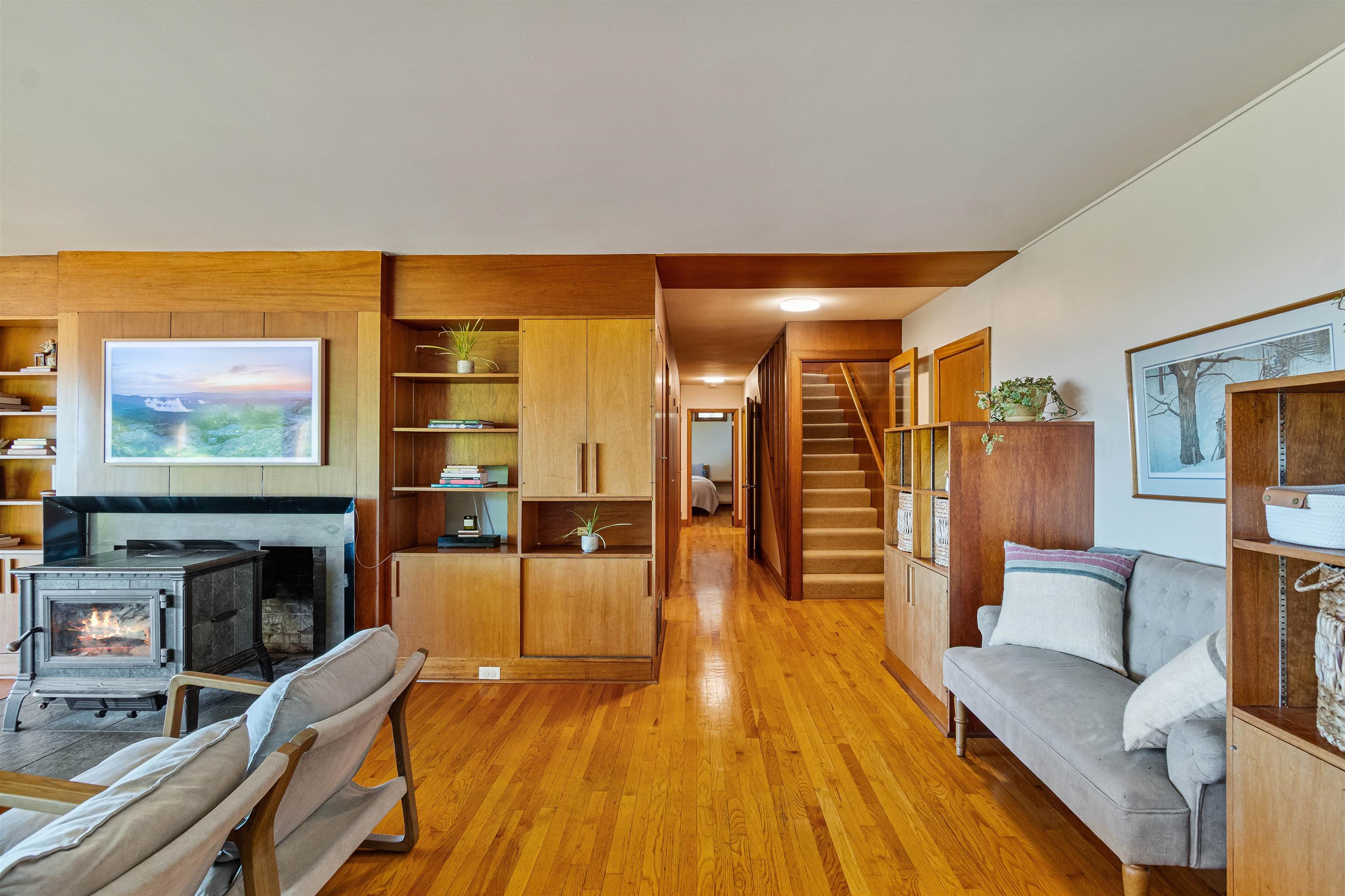 Set on 7.6 private acres with sweeping westerly views, this mid-century modern dream home seamlessly blends timeless design with modern comfort. With 4 bedrooms, 3 baths, and custom built-ins throughout, every inch of this home showcases thoughtful craftsmanship and smart design. The main level features a sun-drenched living room with expansive windows, a cozy wood stove, and extensive built-ins. Head outside onto the spacious wraparound back deck to take in breathtaking views of the foliage. The eat-in kitchen features a bold blue backsplash, under-cabinet lighting, and a dining area with built-in bench seating. Just off the kitchen, a spacious laundry room adds convenience with cabinetry & counter space. The first-floor primary suite is a true retreat with double built-in dressers, dual closets, corner windows framing incredible views, access to the deck and a tiled en-suite bath with a glass-door shower. Also on the main level are a second bedroom, 3/4 bath, and an office with custom built-ins. A unique hallway wall of hidden storage adds unexpected charm & function. Upstairs, you'll find two bedrooms, a 3/4 bath & cozy reading nook. Outside, the U-shaped driveway provides easy in-and-out access, while the attached 2-car garage and bonus storage shed with a custom wood-burning sauna make outdoor living a dream. Just minutes from schools, shopping, dining, and I-89, this location offers privacy and convenience surrounded by Vermont beauty! |