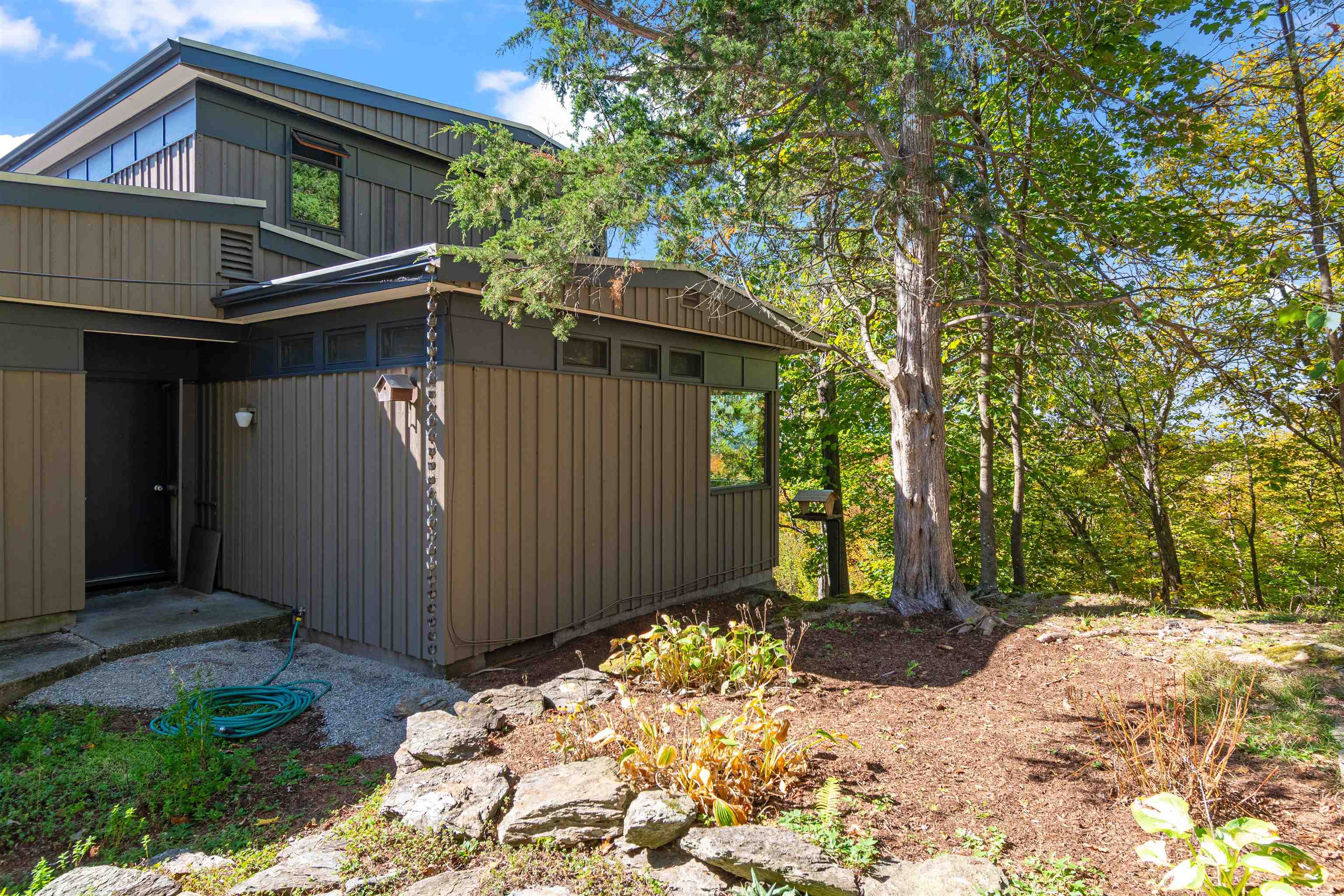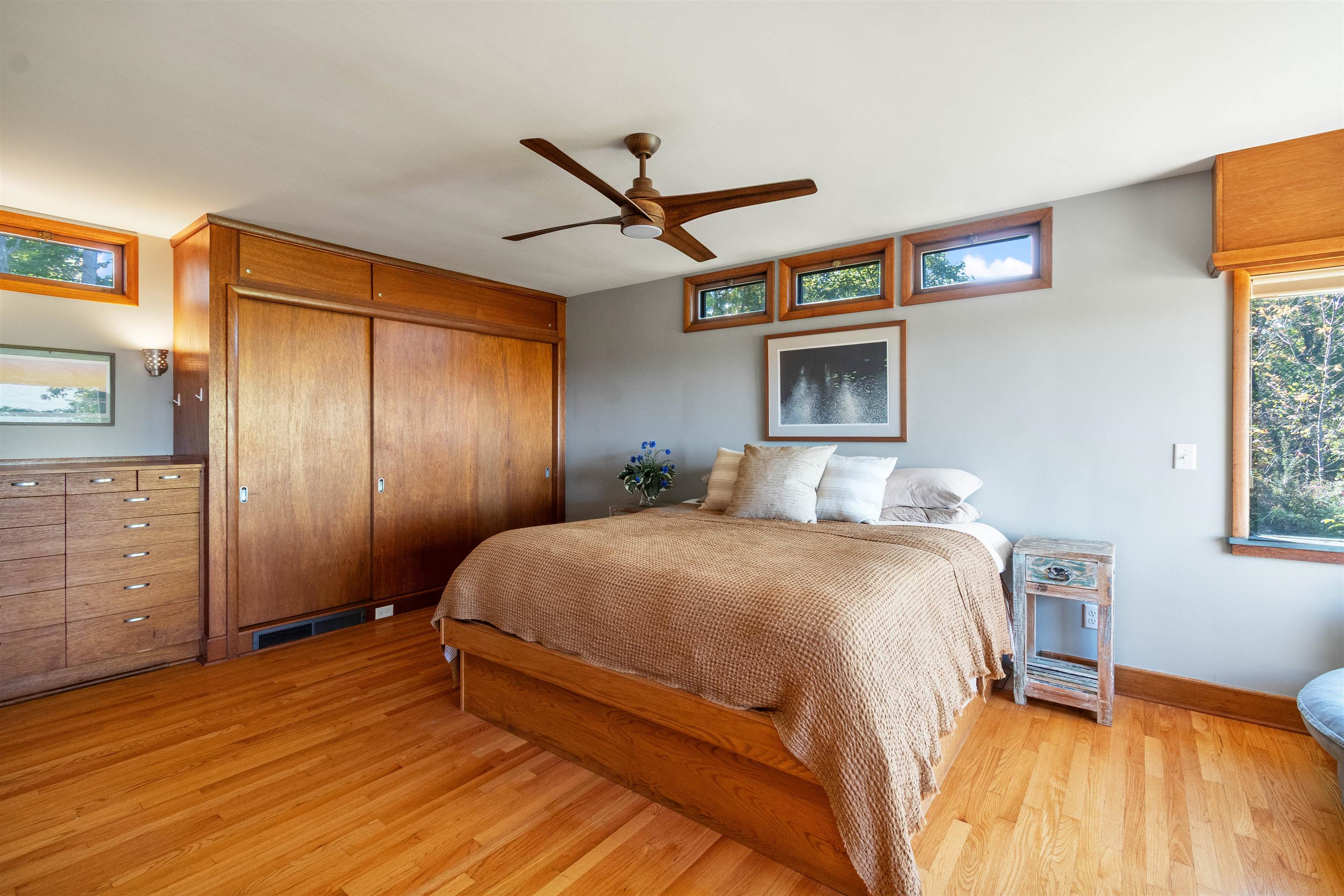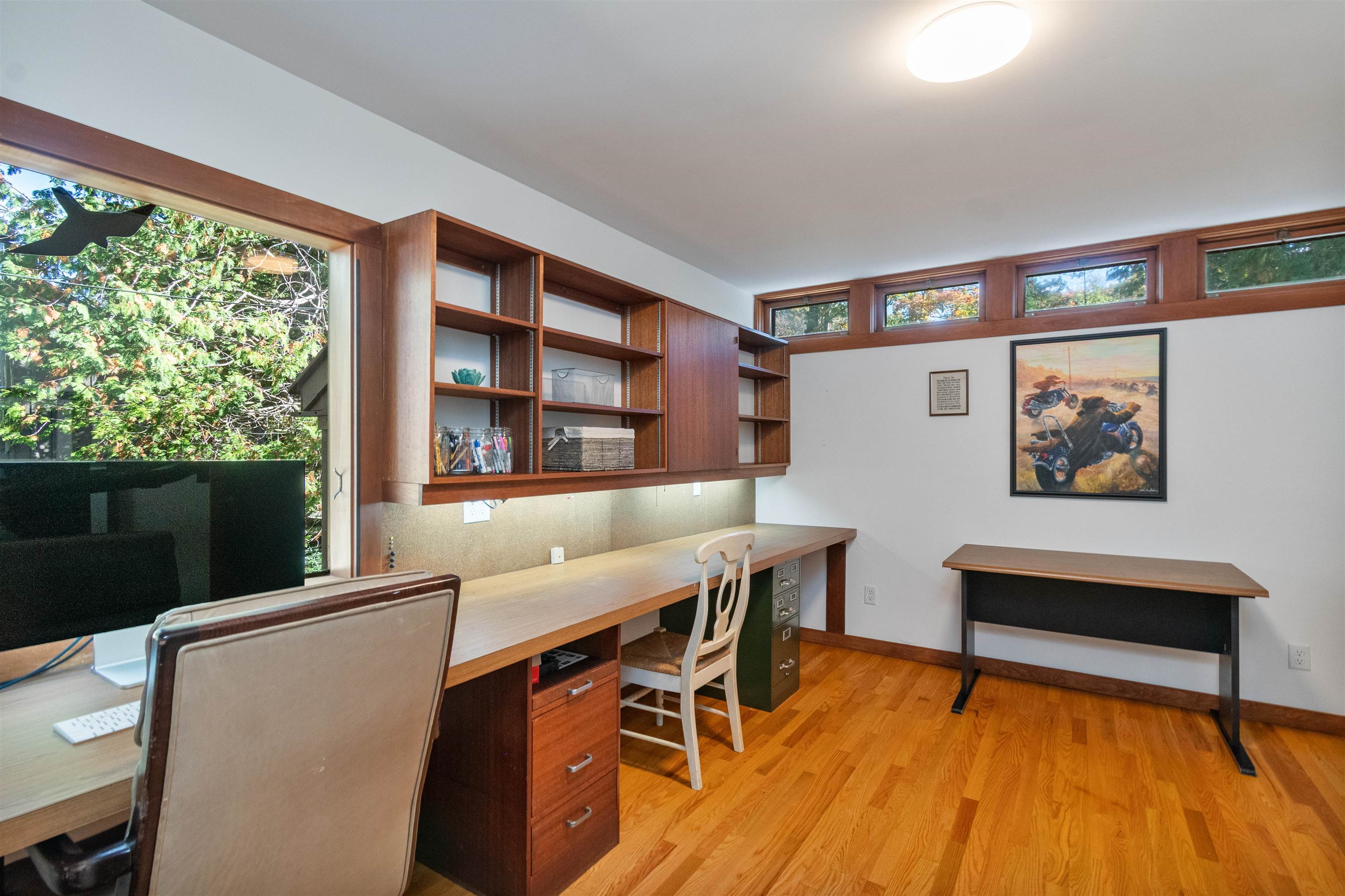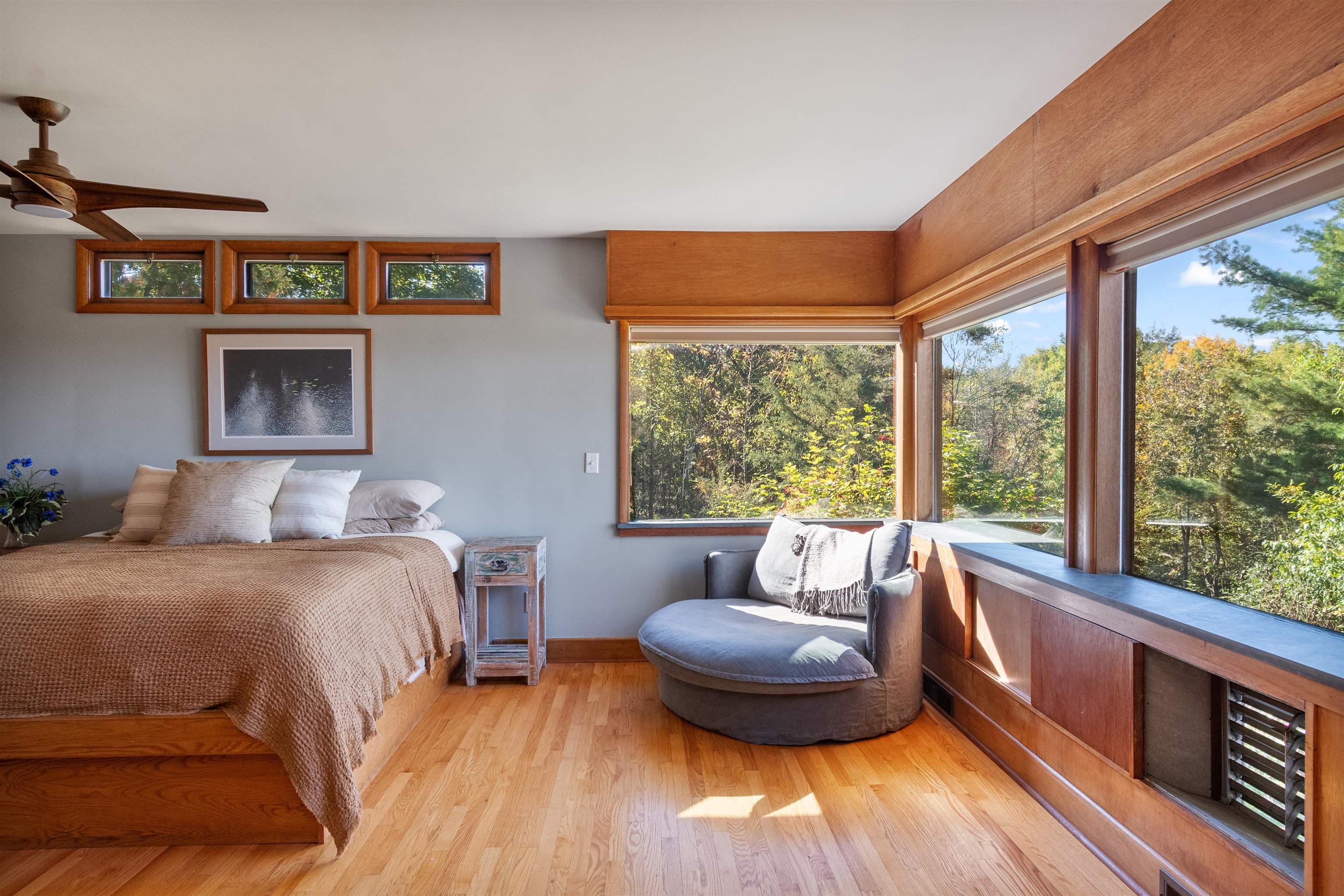 Set on 7.6 private acres with sweeping westerly views, this mid-century modern dream home seamlessly blends timeless design with modern comfort. With 4 bedrooms, 3 baths, and custom built-ins throughout, every inch of this home showcases thoughtful craftsmanship and smart design. The main level features a sun-drenched living room with expansive windows, a cozy wood stove, and extensive built-ins. Head outside onto the spacious wraparound back deck to take in breathtaking views of the foliage. The eat-in kitchen features a bold blue backsplash, under-cabinet lighting, and a dining area with built-in bench seating. Just off the kitchen, a spacious laundry room adds convenience with cabinetry & counter space. The first-floor primary suite is a true retreat with double built-in dressers, dual closets, corner windows framing incredible views, access to the deck and a tiled en-suite bath with a glass-door shower. Also on the main level are a second bedroom, 3/4 bath, and an office with custom built-ins. A unique hallway wall of hidden storage adds unexpected charm & function. Upstairs, you'll find two bedrooms, a 3/4 bath & cozy reading nook. Outside, the U-shaped driveway provides easy in-and-out access, while the attached 2-car garage and bonus storage shed with a custom wood-burning sauna make outdoor living a dream. Just minutes from schools, shopping, dining, and I-89, this location offers privacy and convenience surrounded by Vermont beauty! |