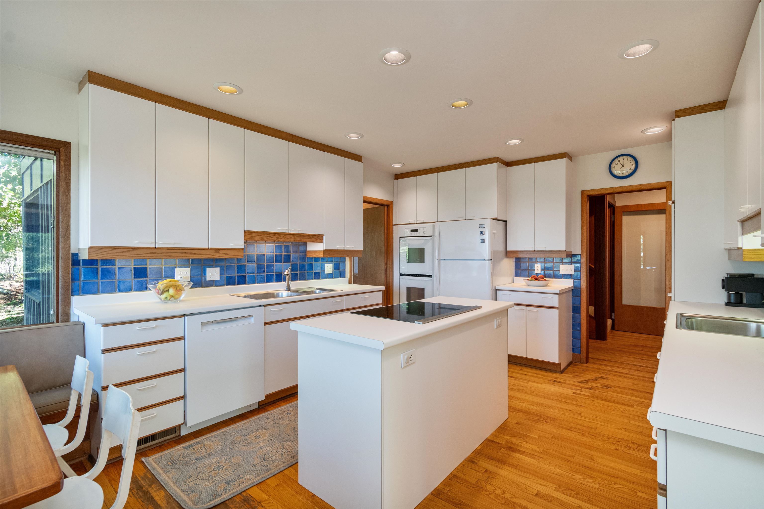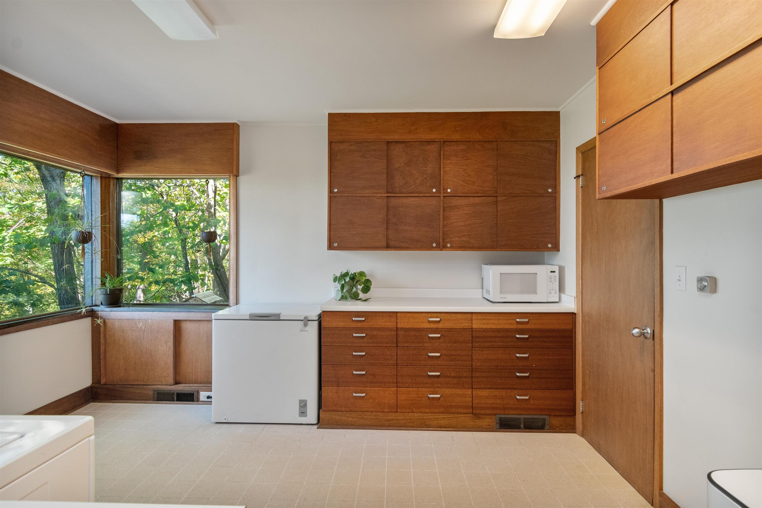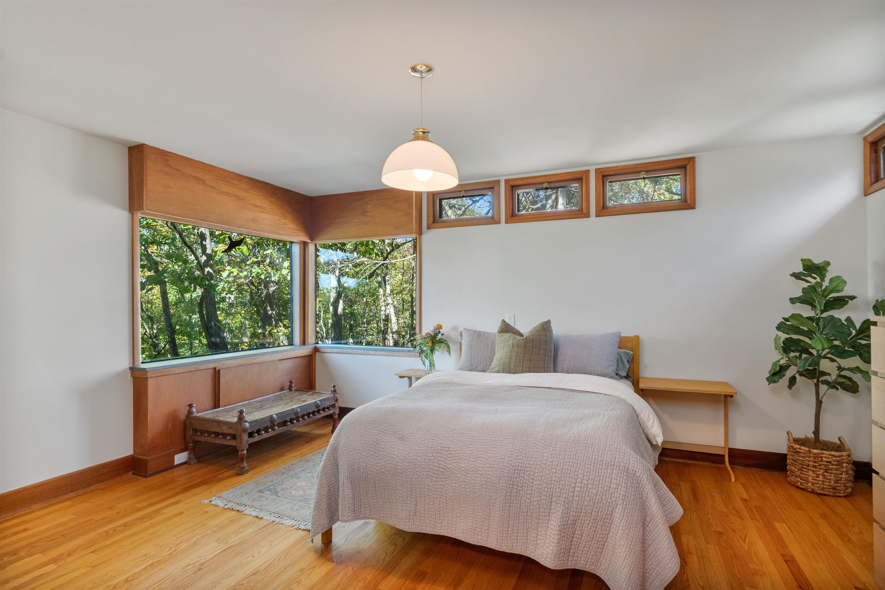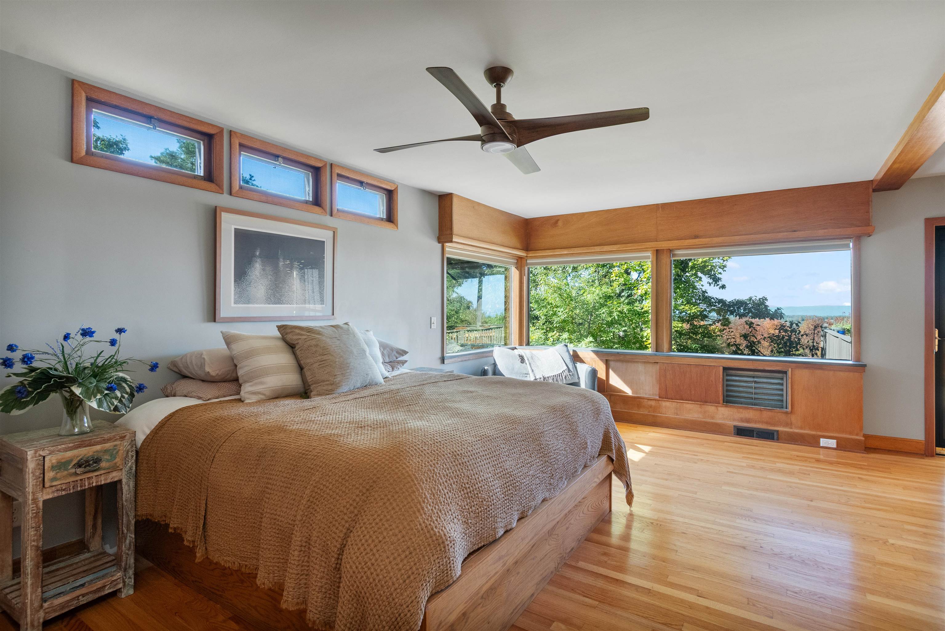 Set on 7.6 private acres with sweeping westerly views, this mid-century modern dream home seamlessly blends timeless design with modern comfort. With 4 bedrooms, 3 baths, and custom built-ins throughout, every inch of this home showcases thoughtful craftsmanship and smart design. The main level features a sun-drenched living room with expansive windows, a cozy wood stove, and extensive built-ins. Head outside onto the spacious wraparound back deck to take in breathtaking views of the foliage. The eat-in kitchen features a bold blue backsplash, under-cabinet lighting, and a dining area with built-in bench seating. Just off the kitchen, a spacious laundry room adds convenience with cabinetry & counter space. The first-floor primary suite is a true retreat with double built-in dressers, dual closets, corner windows framing incredible views, access to the deck and a tiled en-suite bath with a glass-door shower. Also on the main level are a second bedroom, 3/4 bath, and an office with custom built-ins. A unique hallway wall of hidden storage adds unexpected charm & function. Upstairs, you'll find two bedrooms, a 3/4 bath & cozy reading nook. Outside, the U-shaped driveway provides easy in-and-out access, while the attached 2-car garage and bonus storage shed with a custom wood-burning sauna make outdoor living a dream. Just minutes from schools, shopping, dining, and I-89, this location offers privacy and convenience surrounded by Vermont beauty! |